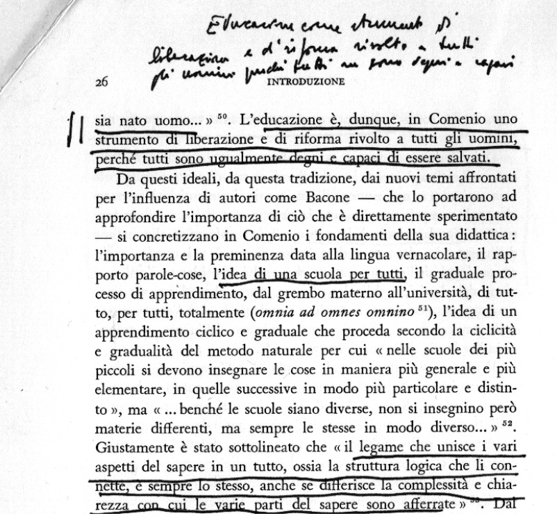 Ma se fruire di un’illusione è meraviglioso, non meno bello è diventarne artefici. E perché mai questo meraviglioso mestiere (creare meraviglie!) dovrebbe continuare ad essere riservato solo ai pochi che hanno la fortuna di avere un padre «illusionista» o che hanno saputo cogliere l’occasione di avere per maestro un artista-studioso disposto ad occuparsi della loro formazione umanistica? È vero che la semplice «lettura» può essere praticata con qualche soddisfazione, per tutta la vita, anche senza possedere strumenti adeguati per poter comprendere la complessità propria dei capolavori artistici; ma è anche vero che il piacere della la «ri-lettura» di quegli stessi capolavori –
