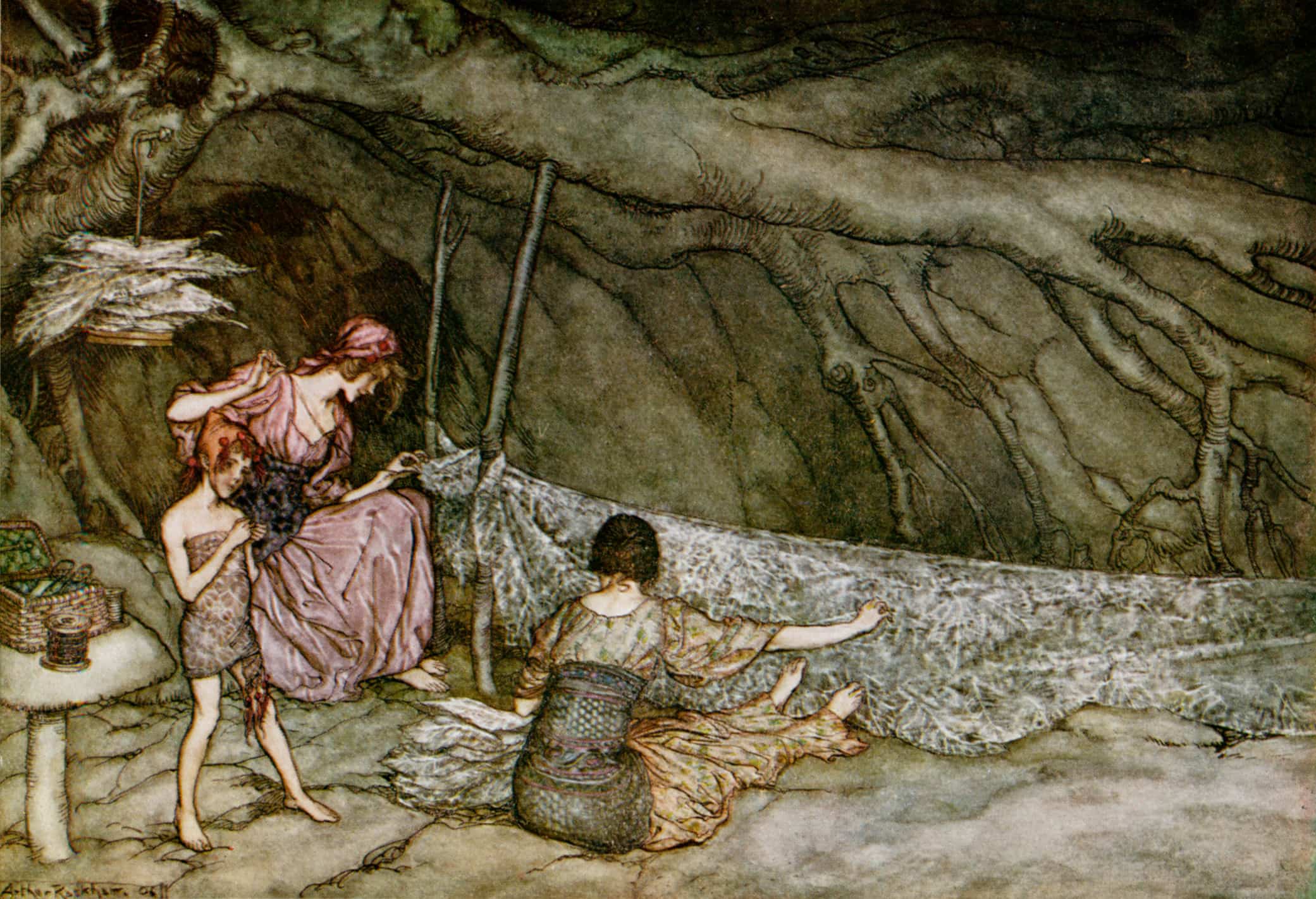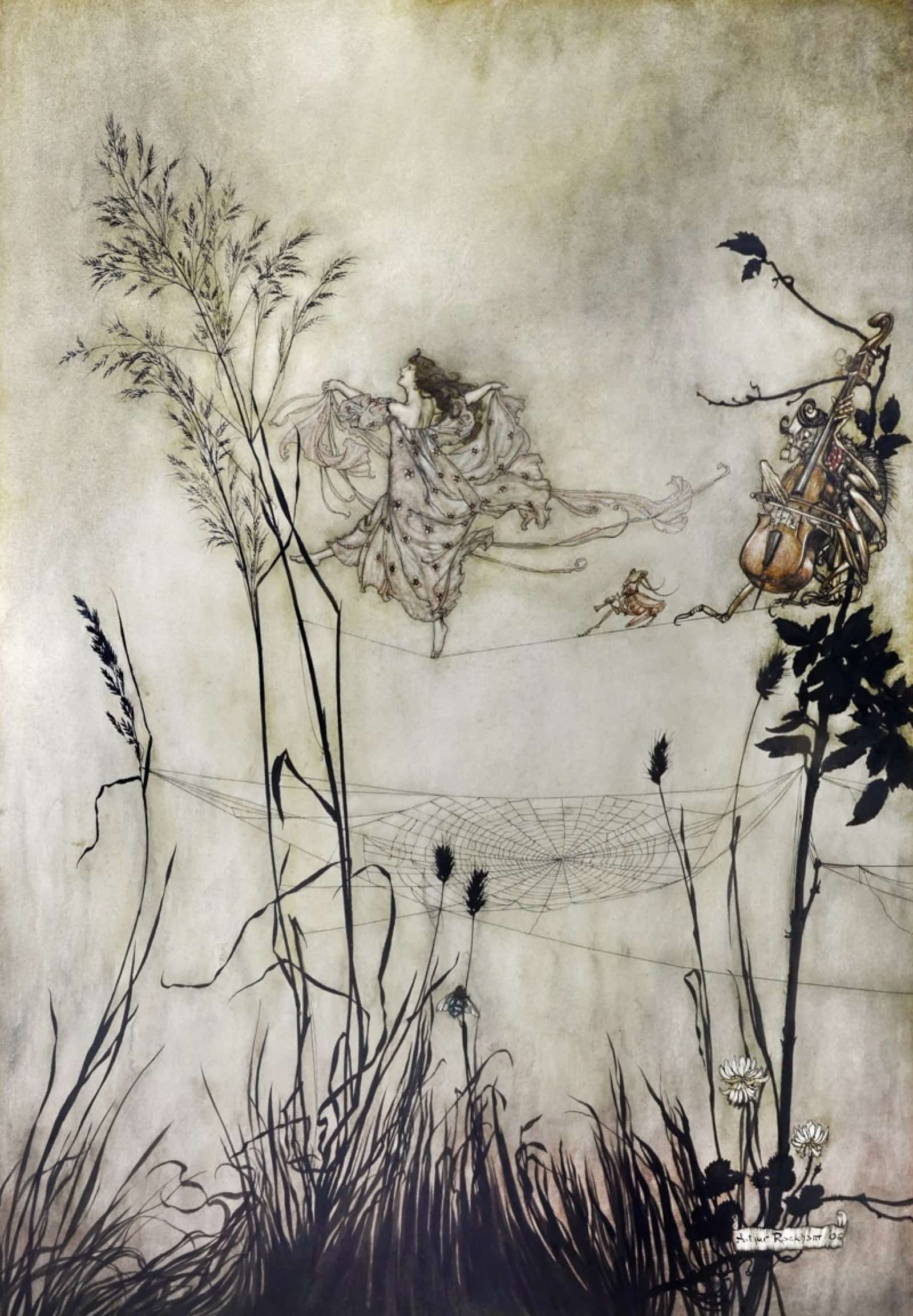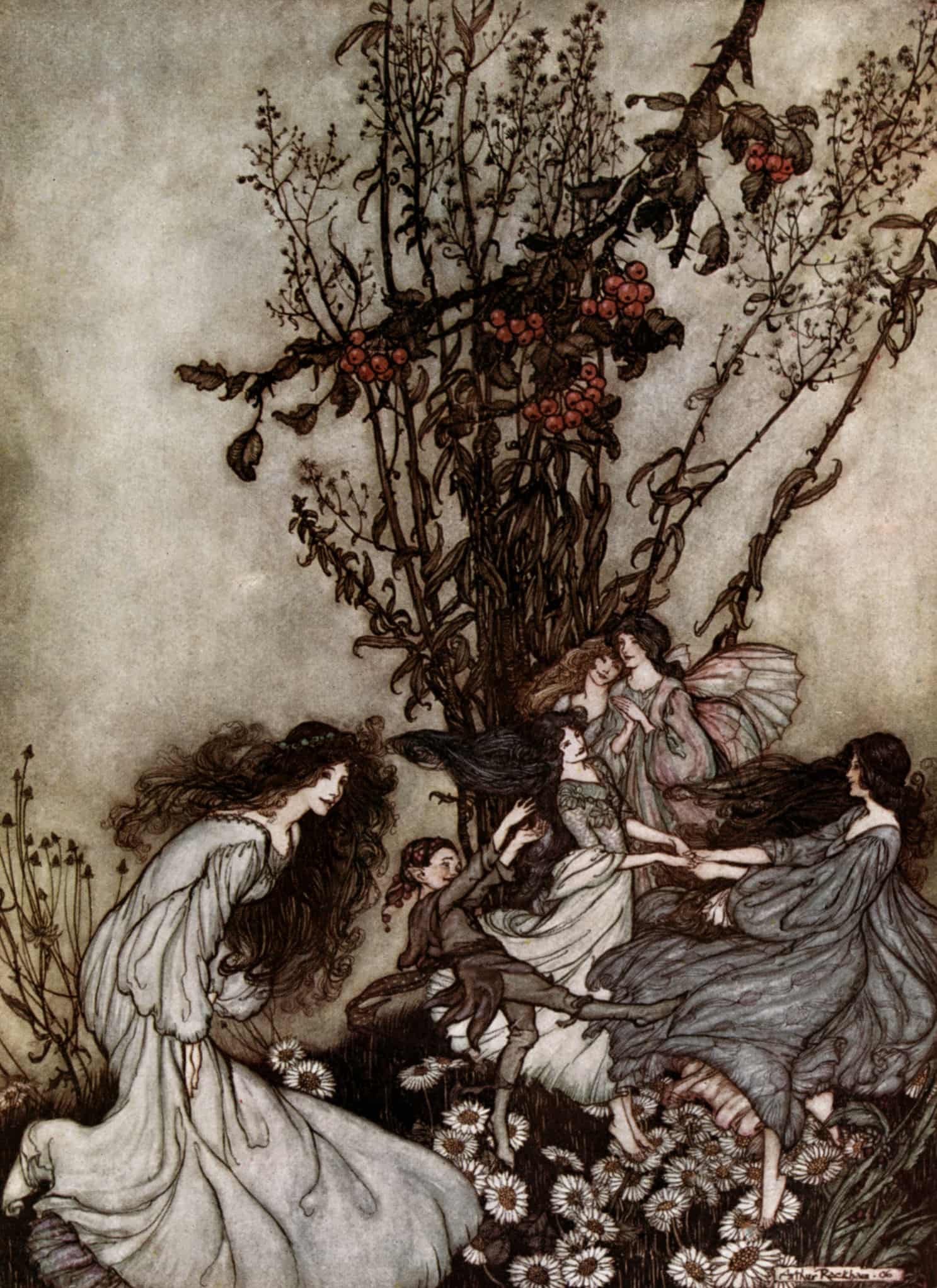 Questa sezione costituisce anche una deviazione pertinente dalla saga di Peter Pan per comprendere come Arthur Rackham, passando da Shakespeare a Barrie, sia riuscito a rendere vivo e autosufficiente quell’universo meraviglioso delle fate e degli spiriti che ospita personaggi straordinari come Titania la regina della fate (nota anche con il nome di “Regina Mab”, usato da Barrie, Shelley e altri narratori che ne hanno alimentato la leggenda), la quale trasmigra senza difficoltà da un testo all’altro: la Titania