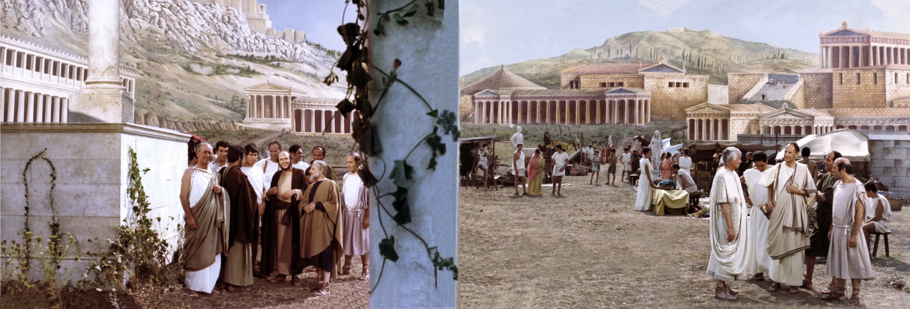 3. un ambiente di lavoro ideale di un umanista del passato e del presente in cui si raccolgono strumenti e oggetti di studio di epoche diverse e in cui si ricostruisce il processo creativo (tanto di Rossellini che dei grandi umanisti del passato come Leon Battista Alberti) che trasforma, in perfetta continuità, studi analitici di opere del passato (della classicità) in