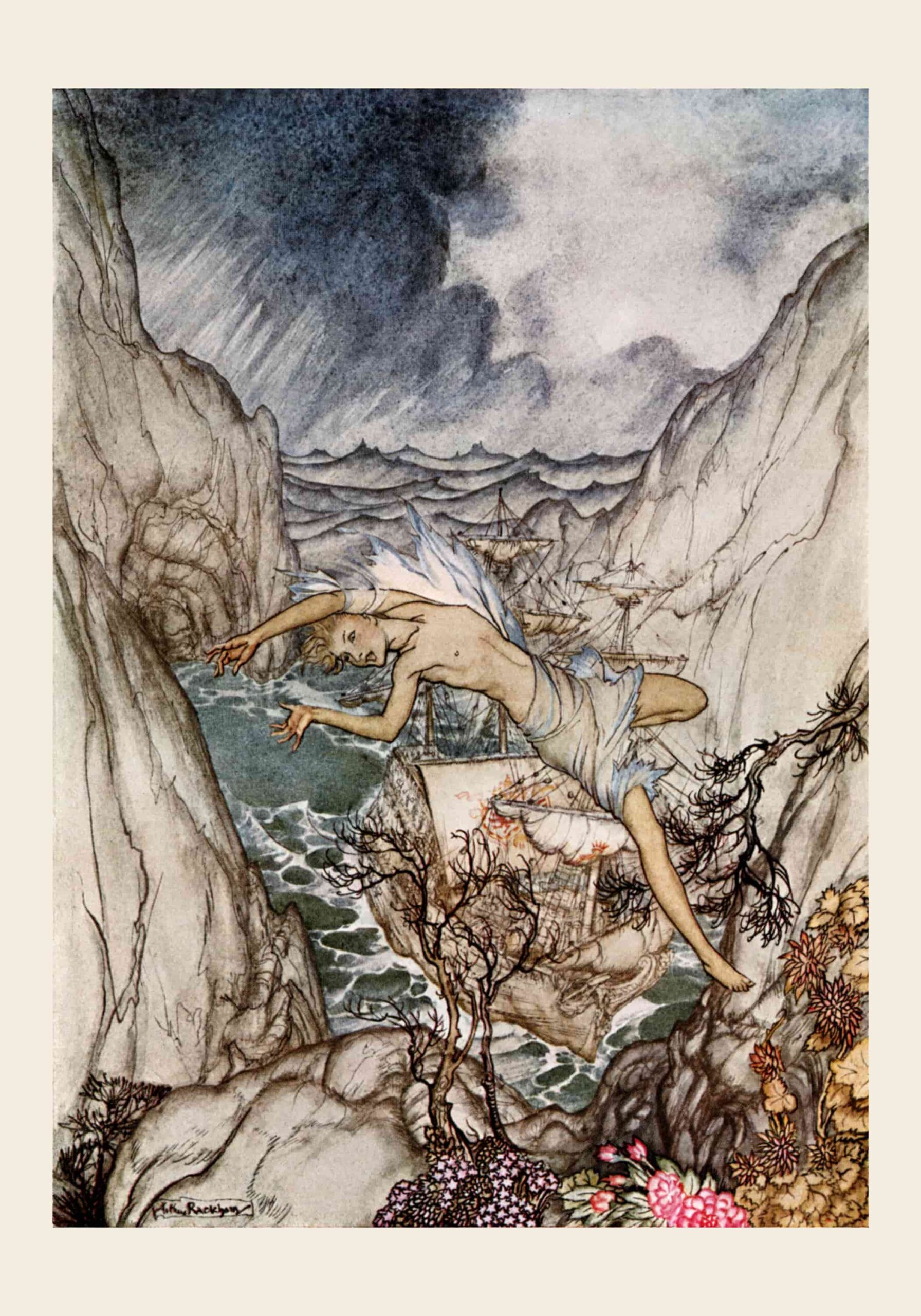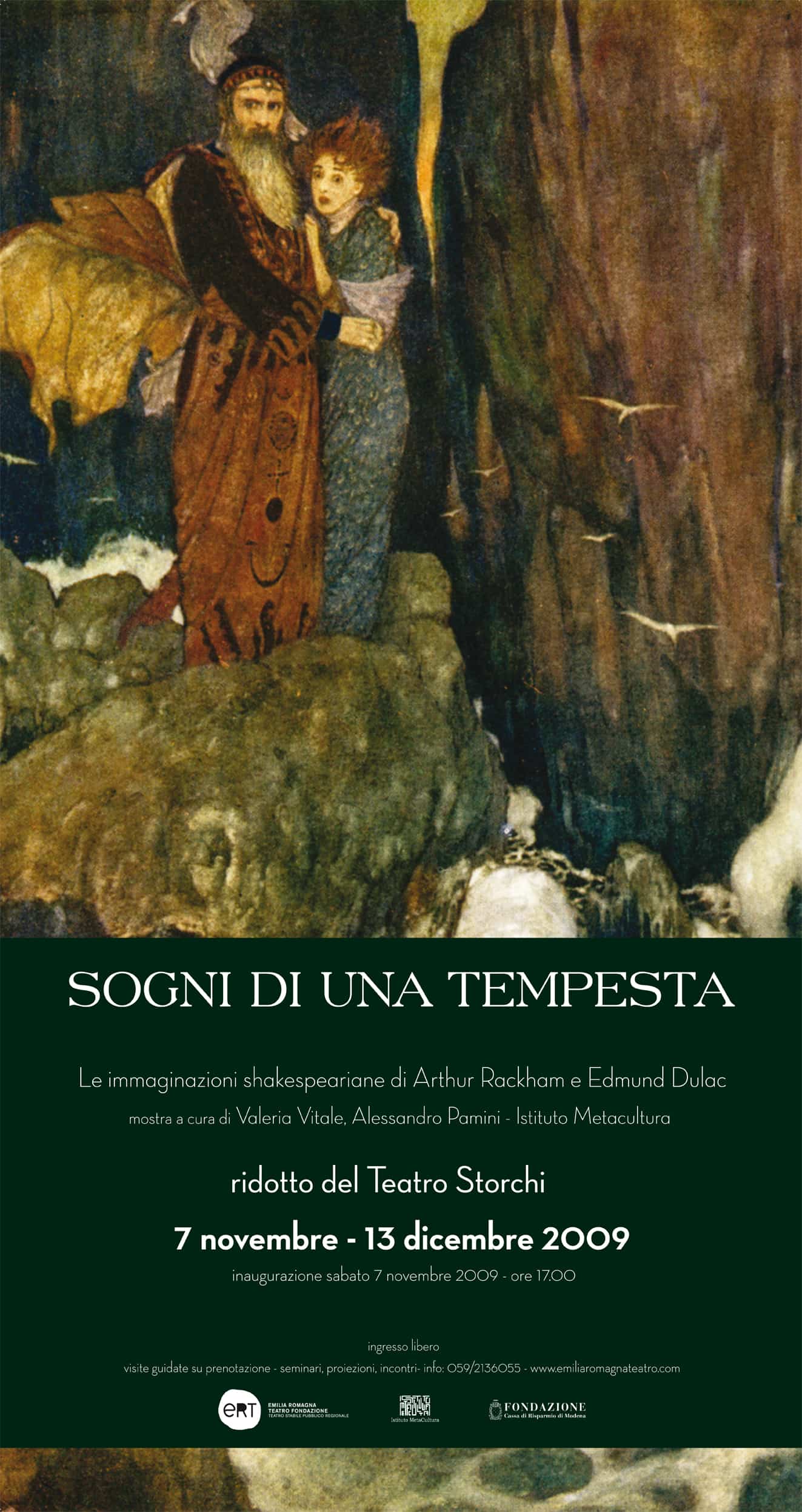 In questo caso decidemmo di affiancare Arthur Rackham a un altro grande compositore di sogni, Edmund Dulac, per aiutarci nell’impresa di raccontare, per immagini, il complesso intreccio de La Tempesta di Shakespeare, e di introdurre così i visitatori della mostra all’ultimo capolavoro di William Shakespeare, di cui il Teatro promotore aveva appena allestito una nuova messa in scena.