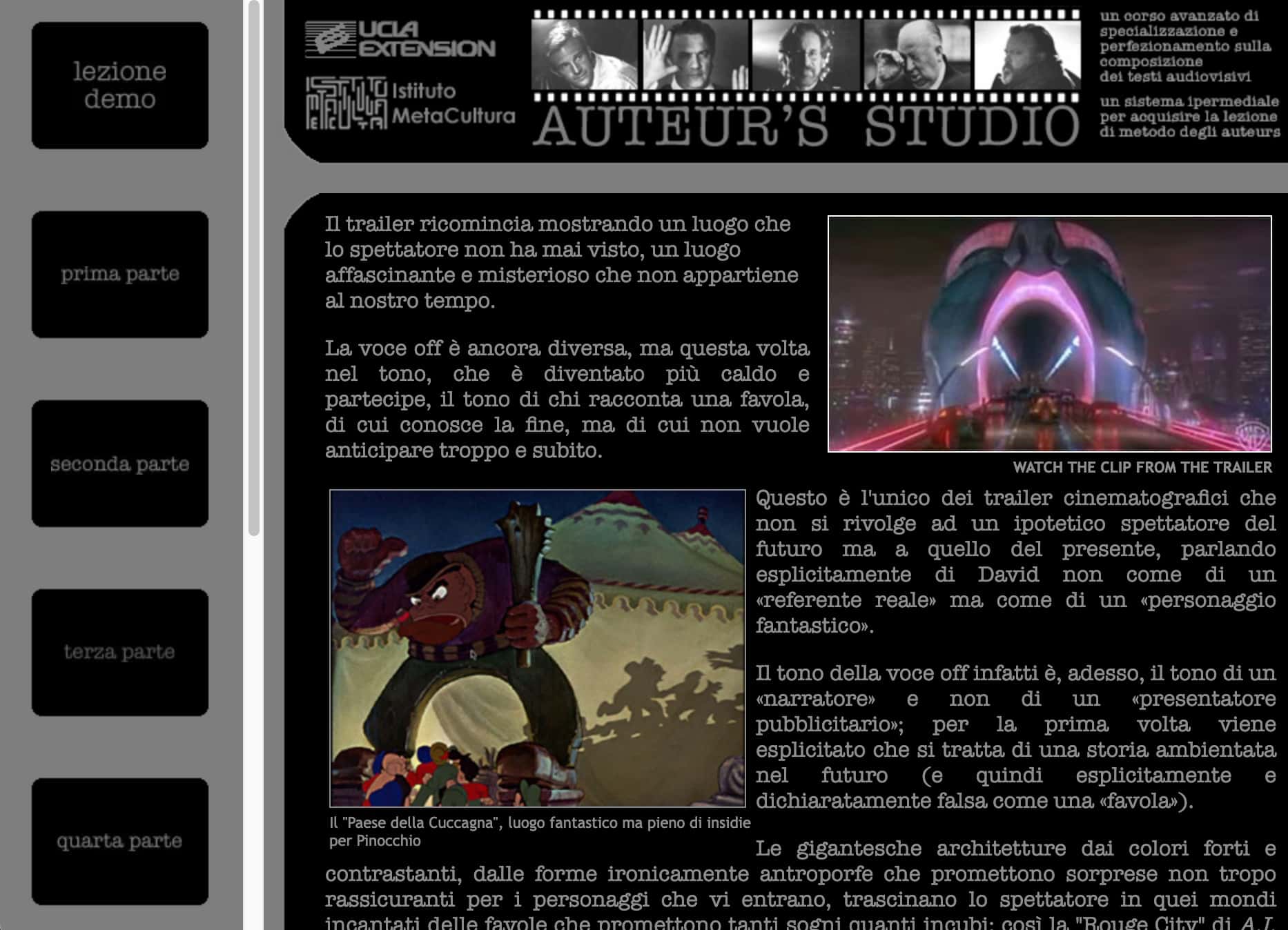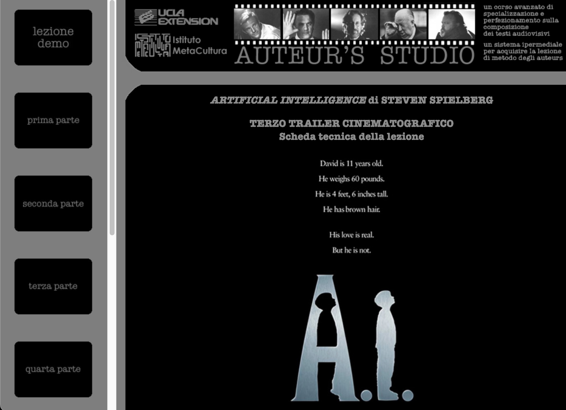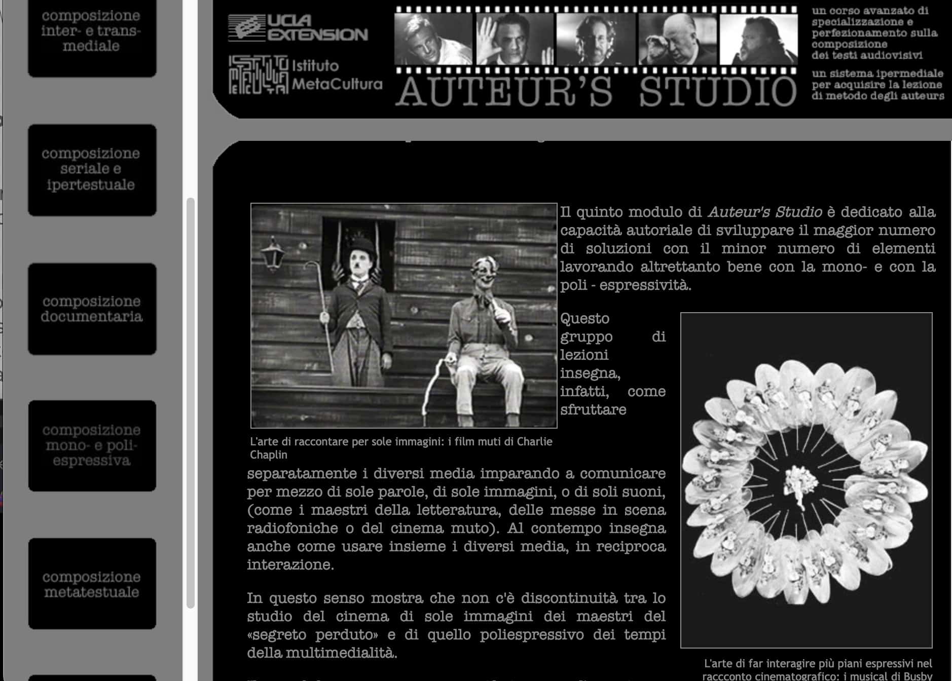 Questo Sistema multiplo, essendo costituito da più moduli autonomi e correlati, ci consente di poter offrire agli allievi della nostra Scuola la possibilità di studiare, sotto la guida dei più grandi narratori cinematografici, ciò che fa dei loro lavori non dei semplici film ma dei capolavori narrativi in forma audiovisiva. La possibilità di studiare ciò che rende questi autori degli «auteur» e non dei comuni cineasti è ciò che meglio rappresenta la nostra stessa Scuola, che vuole offrire, a chi già si occupa di narrazione,