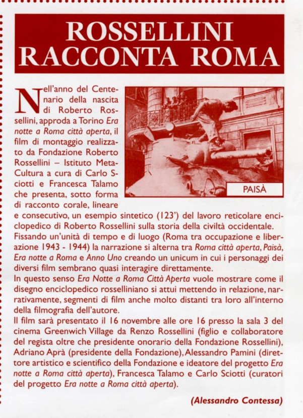 Era notte a Roma città aperta così come la serie 1943-1945. Storie d’Italia tra tra occupazione e liberazione sono inviti ad esplorare ma anche a contribuire a realizzare il progetto polienciclopedico Rosselliniano di cui abbiamo potuto completare solo parti ed esempi per mostrarne non la sua «attualità» ma la sua universalità, la sua importanza per continuare a mantenere vivi gli insegnamenti e gli ideali dei grandi umanisti del passato e del presente, per contribuire a dissolvere i luoghi comuni e pregiudizi intorno alla stessa tradizione umanistica che da un po’ di tempo per ignoranza e malafede viene confusa con il colonialismo.