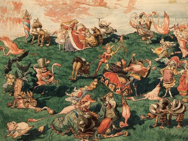 Lewis Carroll interviene infatti sulla scena come personaggio-autore, anzitutto nel prologo, quando, vestendo i panni del reverendo Dodgson, porta in gita in barca Alice e le sue sorelline; così egli dà inizio al gioco racconto sfidando le piccole a comporre insieme a lui il racconto labirintico; compare inoltre durante il racconto e nell’epilogo quando, sotto mentite spoglie, vestendo i panni di alcuni dei suoi personaggi, ragiona con la sua piccola allieva riguardo lo scioglimento di alcuni enigmi.