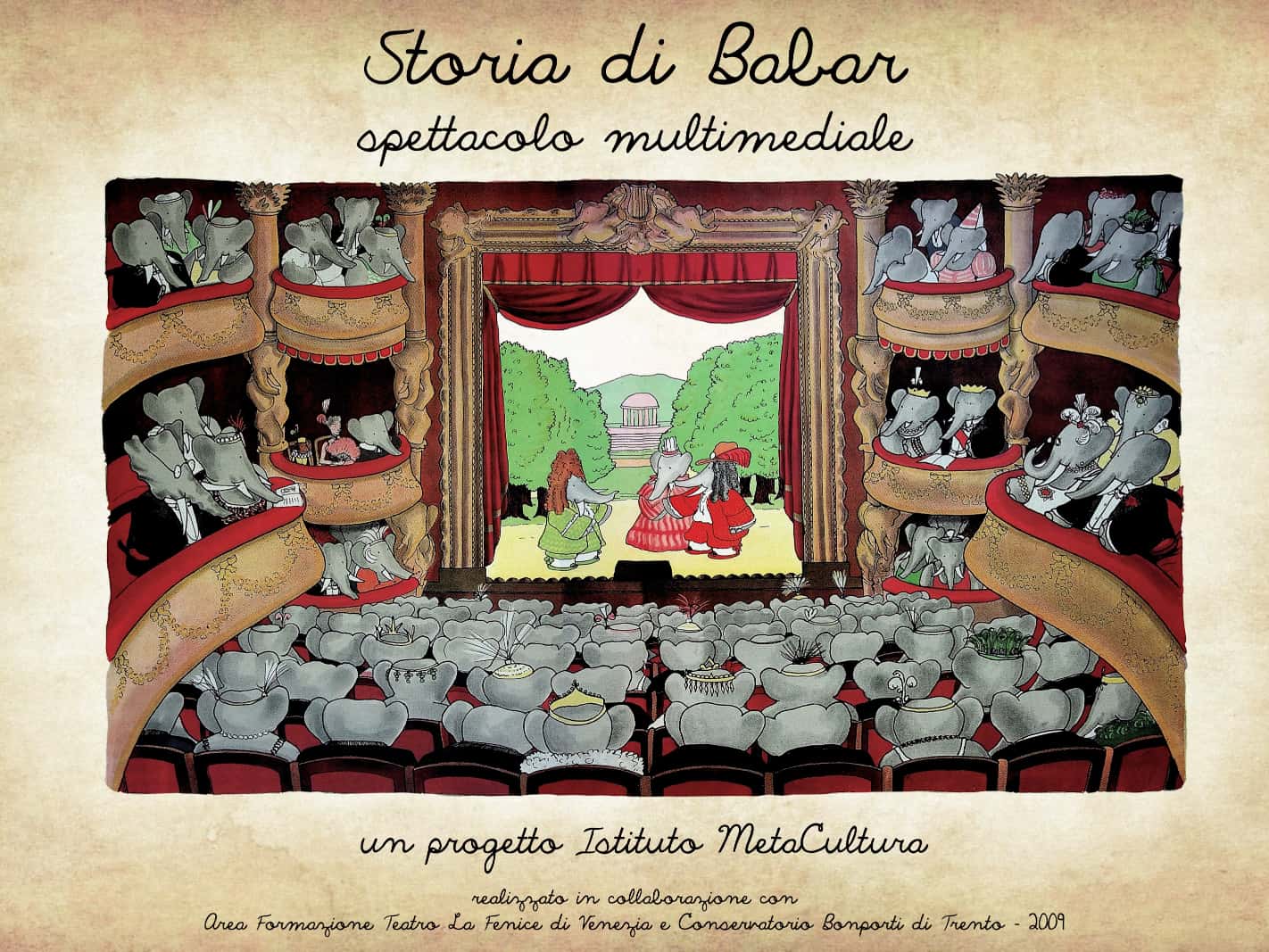 L’idea che volevamo sviluppare era per noi chiara: le tavole scritte e disegnate da Jean de Brunhoff, la partitura scritta da Francis Poulenc, e i tentativi di trarre dei cartoni animati – non musicali – realizzati negli anni 60 da Bill Melendez sulla base delle prime storie di Babar l’elefantino, potevano convergere e integrarsi in un unico spettacolo multimediale componendo un’unica partitura e coreografia che non penalizzasse le tre forme espressive, ma le valorizzasse correlandole in un’unica narrazione senza ridondanza e dipendenza tra loro.