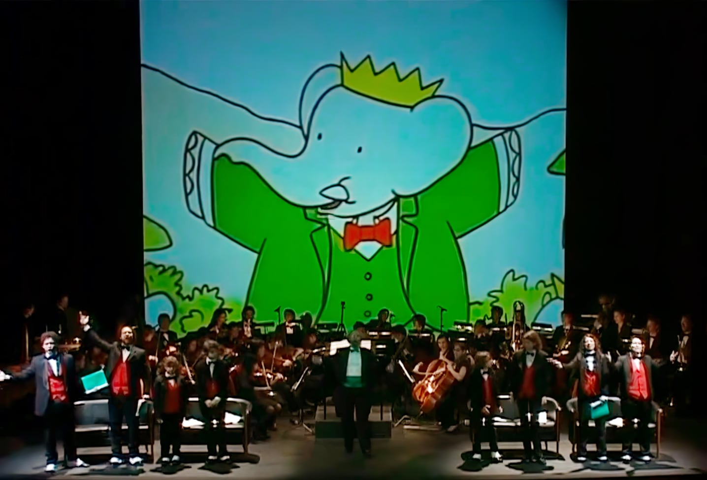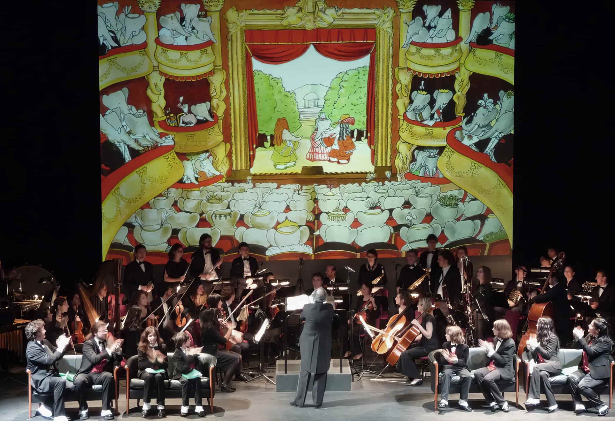 In questo procedimento insieme scientifico e artistico abbiamo seguito la lezione disneyana, ricavandola, ad esempio, dai cartoni animati tratti dalle storie di Winnie the Pooh di Milne e Shepard, o dal Peter and the Wolf di Prokofiev. Il risultato che abbiamo potuto offrire ai nostri spettatori – principalmente bimbi di ogni età – è stata l’incredibile ed entusiasmante interazione sulla scena, dal vivo, tra la musica dell’orchestra e la recitazione dei giovani attori e le immagini animate tratte dalle storie di Jean de Brunhoff sincronizzate in tempo reale con la musica e la recitazione.